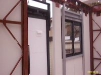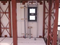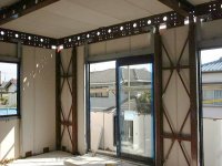 同時に、アルミサッシも取り付けられています。サッシが直接鉄骨躯体に取り付けられているのがわかります。(直接鉄骨躯体に取り付けられているため、長い年月が過ぎても狂いが生じにくく、すきま風などが生じる心配もないとのことです)