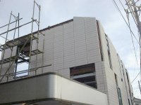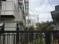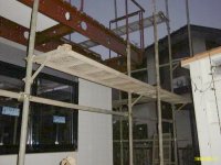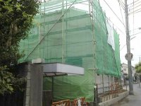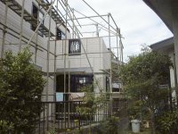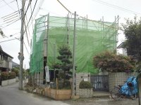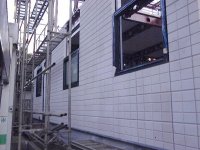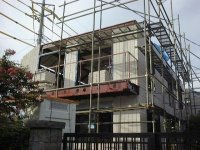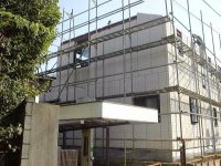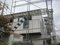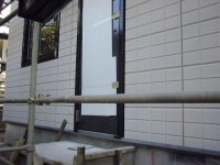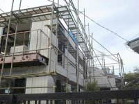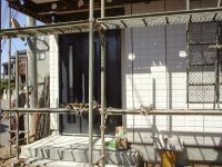 玄関ドアーの取り付けが終了していました。足場の組み立て作業が行われています。