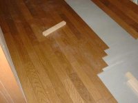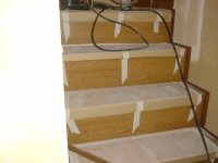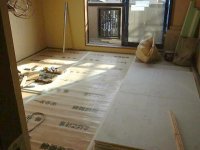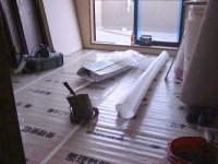 作業は進んで、2階の床材の張り付け作業を行っていて、終了した部屋は養生シートがひかれていました。